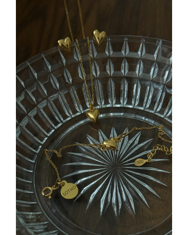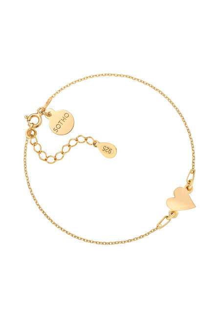 Złota bransoletka z małym serduszkiem i zawieszką z logo marki. Całość wykonana ze srebra 925 powlekanego 24 karatowym żółtym złotem.
