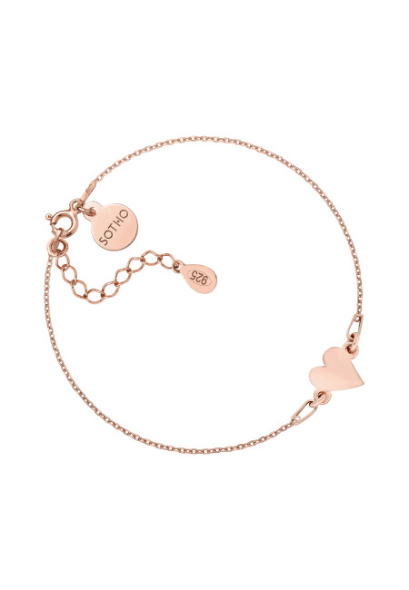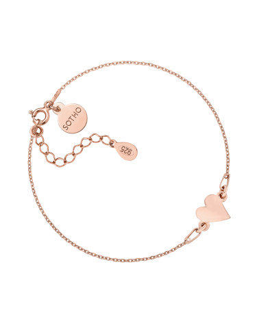 Złota bransoletka z małym serduszkiem i zawieszką z logo marki. Całość wykonana ze srebra 925 powlekanego 18 karatowym różowym złotem.