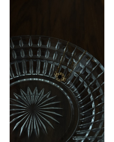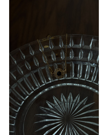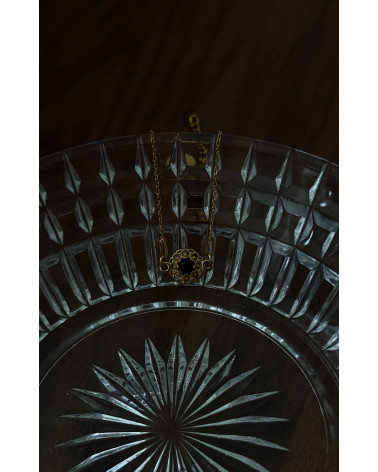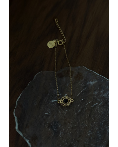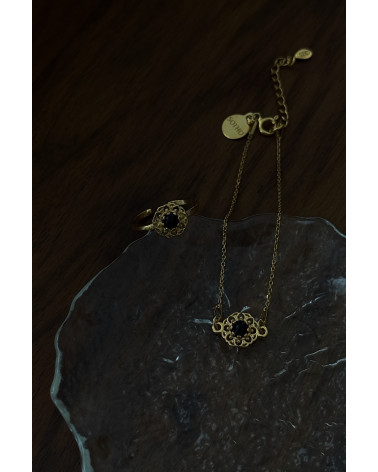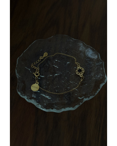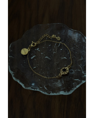 Złota bransoletka z rozetą, onyksem i zawieszką z logo marki. Całość wykonana ze srebra 925 powlekanego 24 karatowym żółtym złotem.