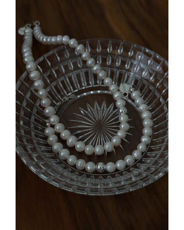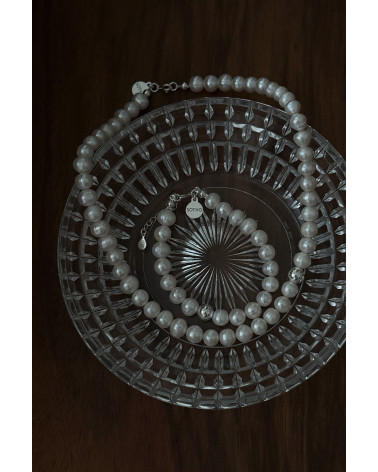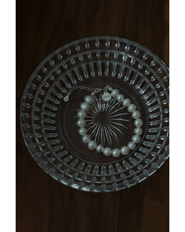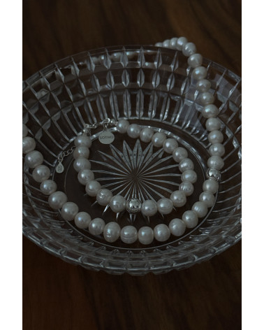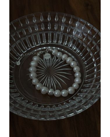 Srebrna bransoletka wykonana z naturalnych pereł słodkowodnych z kulką oraz zawieszką z logo marki. Wszystkie elementy wykonane ze srebra 925.