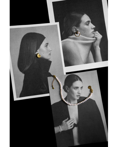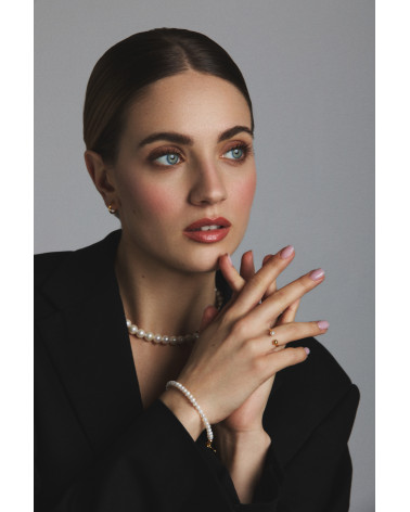 Bransoletka wykonana z naturalnych pereł słodkowodnych, zdobiona zawieszką z logo marki. Wszystkie elementy wykonane ze srebra 925 powlekanego 24 karatowym żółtym złotem. Perły są nieregularne, unikatowe, delikatnie różnią się od siebie i mogą różnić się od tych na zdjęciu.