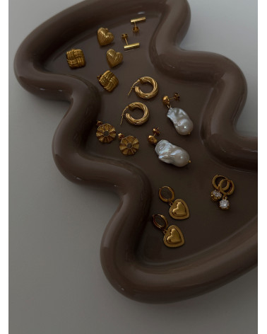 Złote kolczyki serca z rowkowaną powierzchnią. Całość wykonana ze srebra 925 powlekanego 24 karatowym żółtym złotem. Zapinane na sztyft. Kolczyki posiadają zapięcia (baranki).