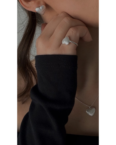 Srebrne kolczyki serca z rowkowaną powierzchnią. Całość wykonana ze srebra 925. Zapinane na sztyft. Kolczyki posiadają zapięcia (baranki).