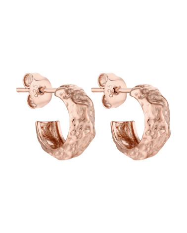 Złote kolczyki grube małe gniecione półkola. Całość wykonana ze srebra 925 powlekanego 18 karatowym różowym złotem. Zapinane na sztyft. Kolczyki posiadają zapięcia (baranki).