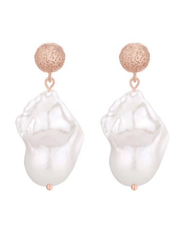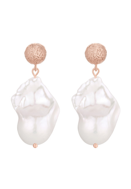 Złote kolczyki z naturalnymi nieregularnymi barokowymi perłami. Całość wykonana ze srebra 925 powlekanego 18 karatowym różowym złotem. Zapinane na sztyft. Kolczyki posiadają zapięcia (baranki).