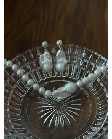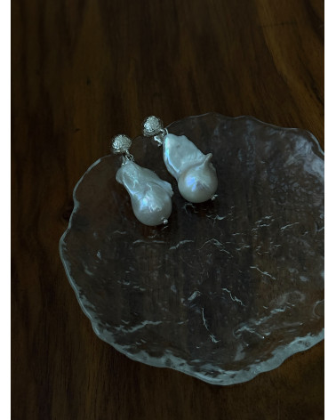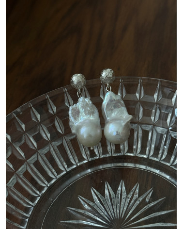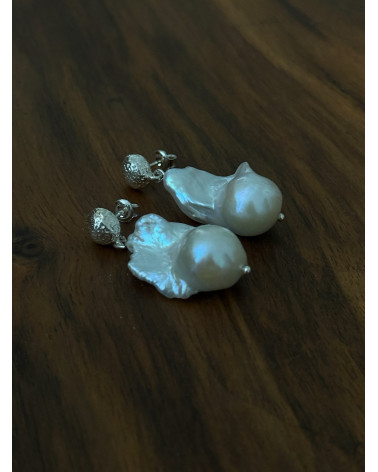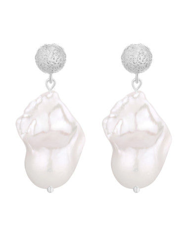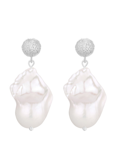 Srebrne kolczyki z naturalnymi nieregularnymi barokowymi perłami. Całość wykonana ze srebra 925. Zapinane na sztyft. Kolczyki posiadają zapięcia (baranki).
