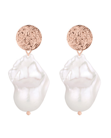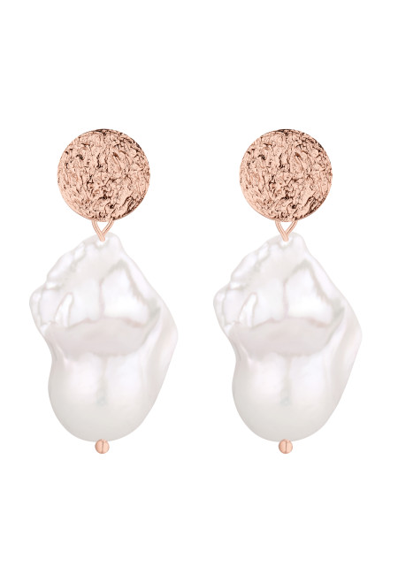 Złote kolczyki z naturalnymi nieregularnymi barokowymi perłami. Całość wykonana ze srebra 925 powlekanego 18 karatowym różowym złotem. Zapinane na sztyft. Kolczyki posiadają zapięcia (baranki).