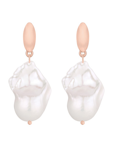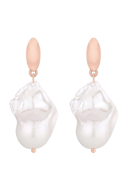 Złote kolczyki z naturalnymi nieregularnymi barokowymi perłami. Całość wykonana ze srebra 925 powlekanego 18 karatowym różowym złotem. Zapinane na sztyft. Kolczyki posiadają zapięcia (baranki).