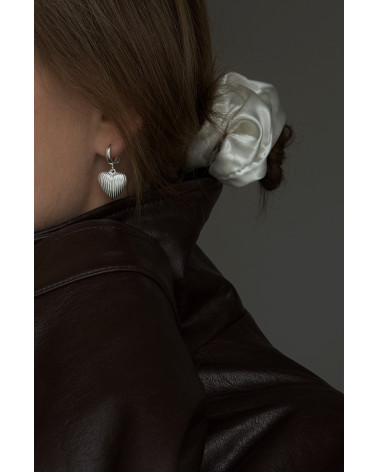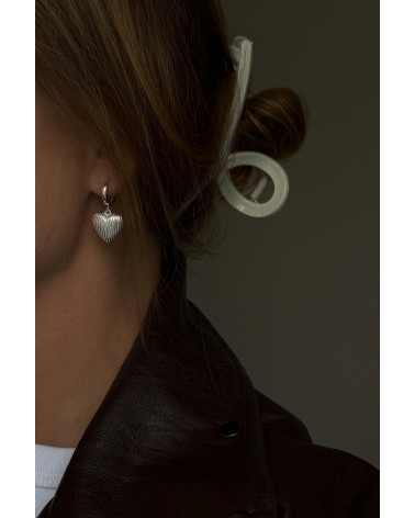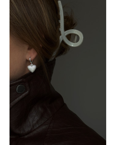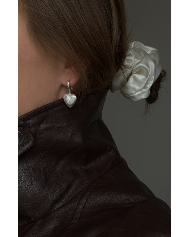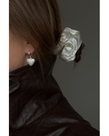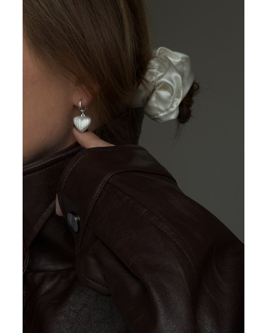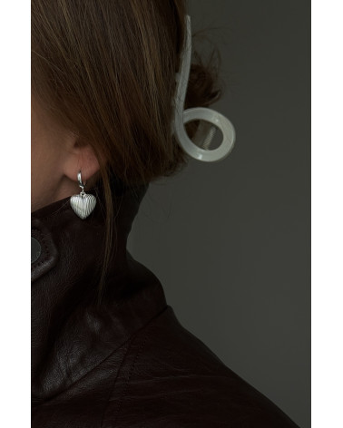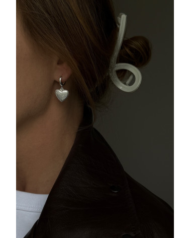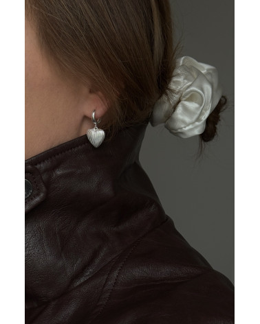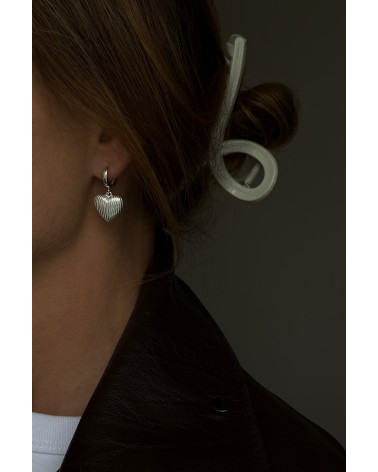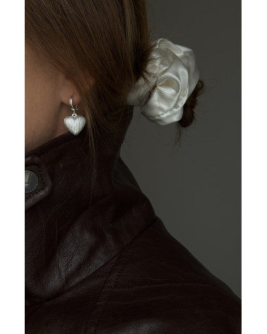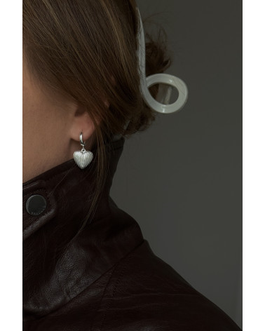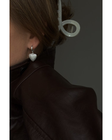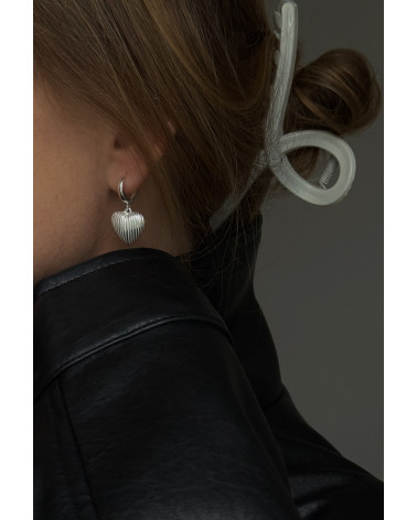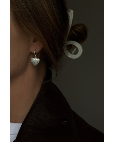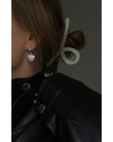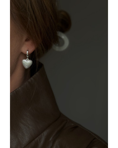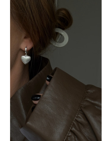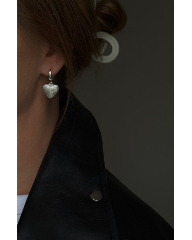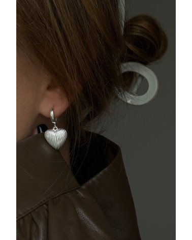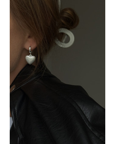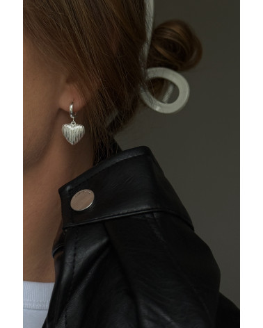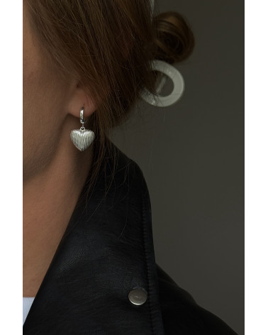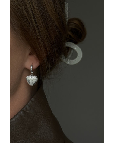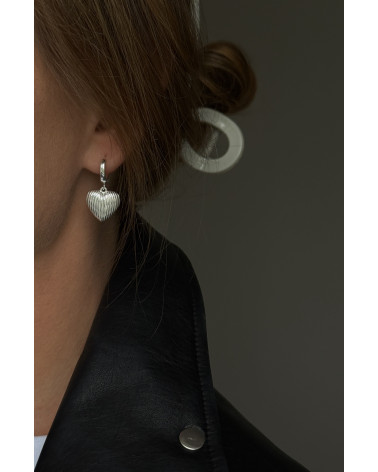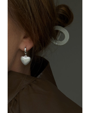 Srebrne kolczyki serca z rowkowaną powierzchnią zawieszone na zamykanych biglach.. Całość wykonana ze srebra 925.