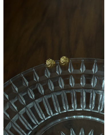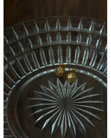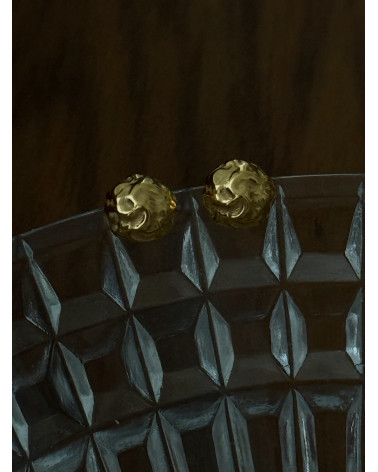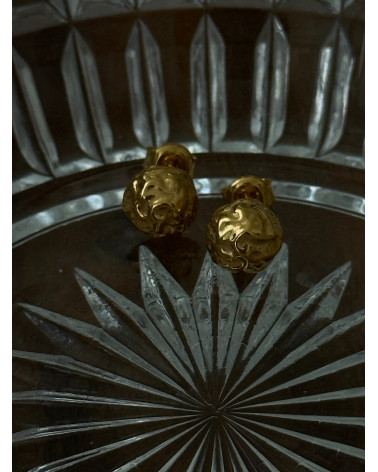 Złote kolczyki małe gniecione przestrzenne koła. Całość wykonana ze srebra 925 powlekanego 24 karatowym żółtym złotem. Zapinane na sztyft. Kolczyki posiadają zapięcia (baranki).