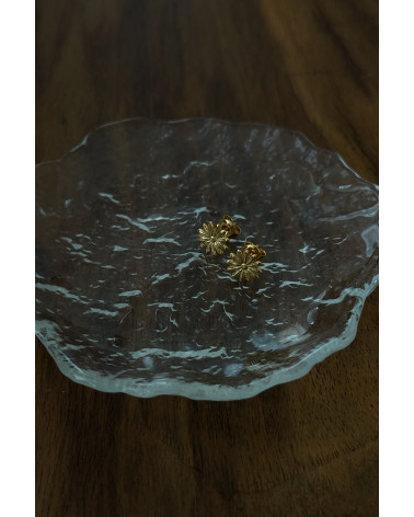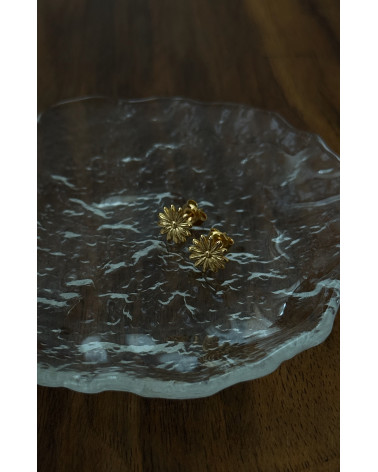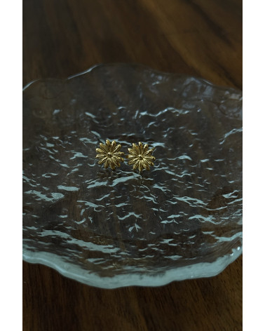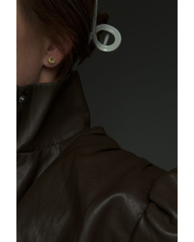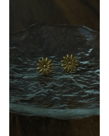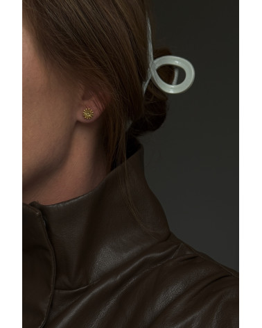 Złote kolczyki stokrotki. Całość wykonana ze srebra 925 powlekanego 24 karatowym żółtym złotem. Zapinane na sztyft. Kolczyki posiadają zapięcia (baranki).