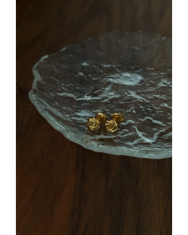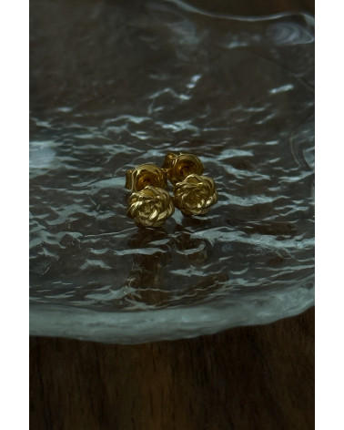Złote kolczyki różyczki. Całość wykonana ze srebra 925 powlekanego 24 karatowym żółtym złotem. Zapinane na sztyft. Kolczyki posiadają zapięcia (baranki).