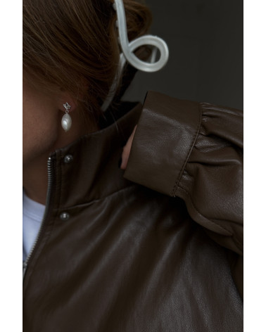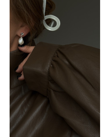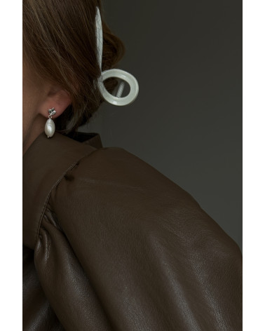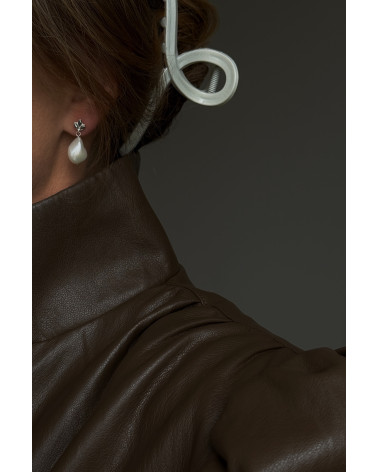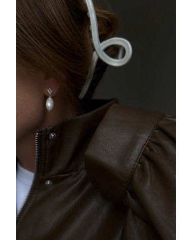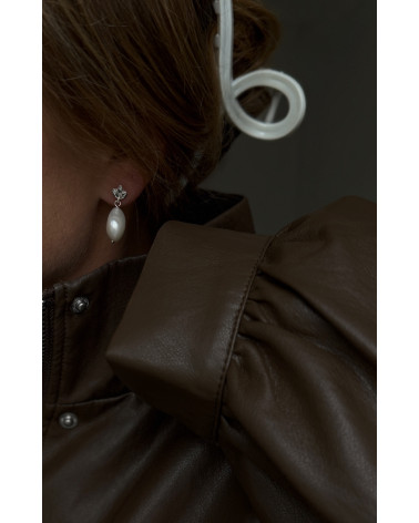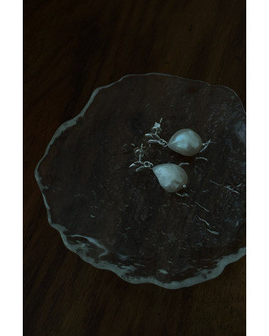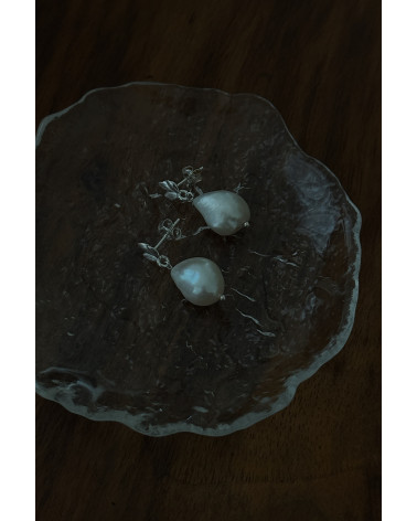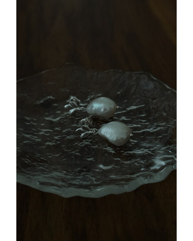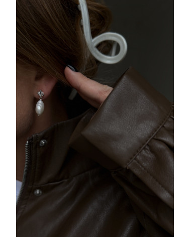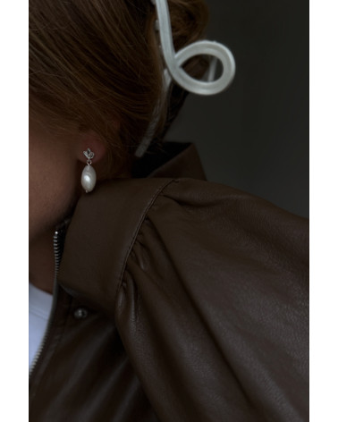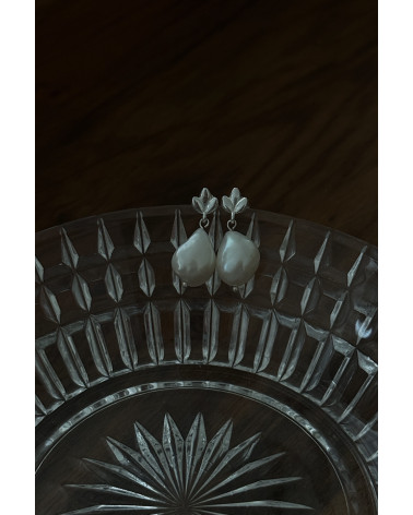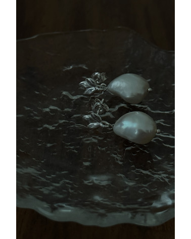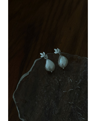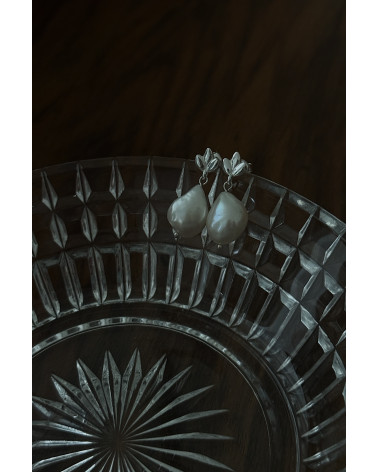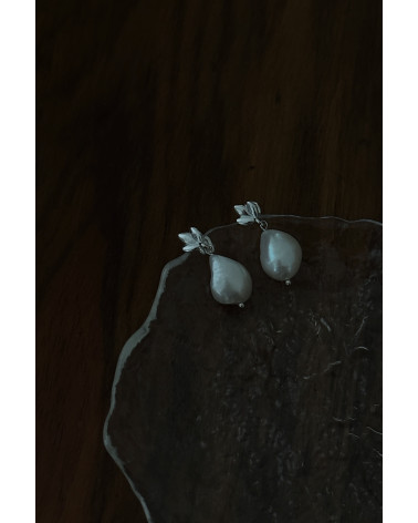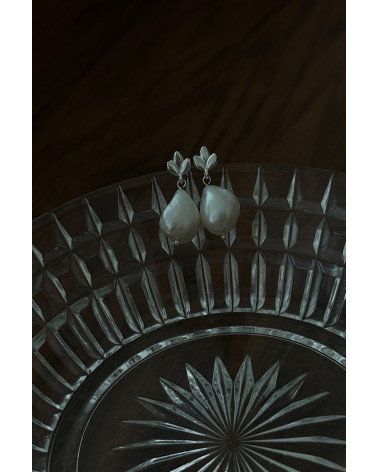 Srebrne kolczyki listki z naturalnymi nieregularnymi perłami. Całość wykonana ze srebra 925. Zapinane na sztyft. Kolczyki posiadają zapięcia (baranki).