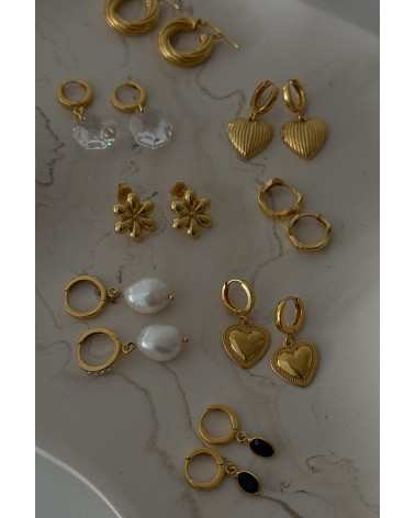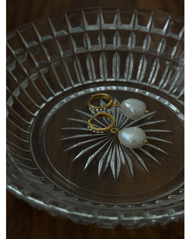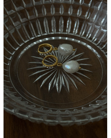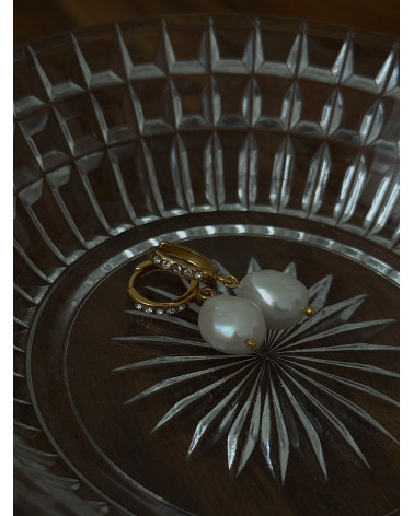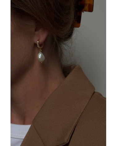 Złote kolczyki z perłami naturalnymi i kryształkami Preciosa. Całość wykonana ze srebra 925 powlekanego 24 karatowym żółtym złotem.