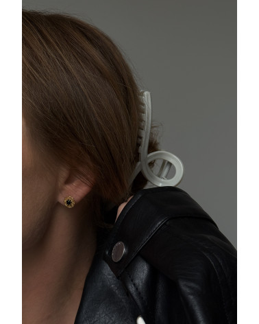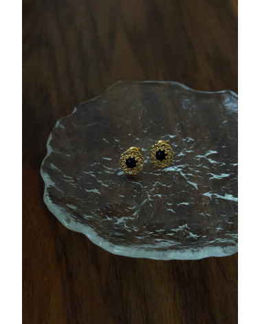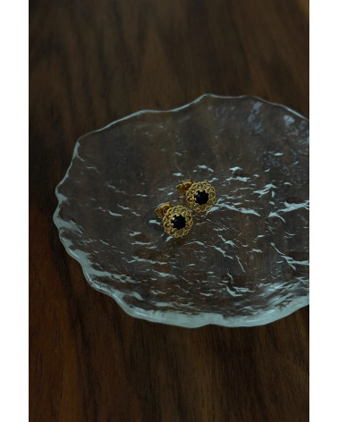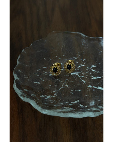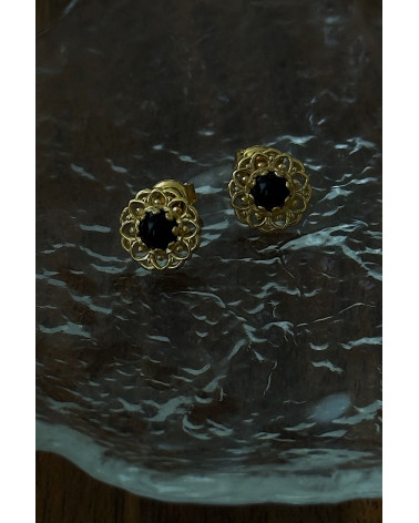 Złote kolczyki rozety z czarnymi onyksami. Całość wykonana ze srebra 925 powlekanego 24 karatowym żółtym złotem. Kolczyki posiadają zapięcia (baranki).