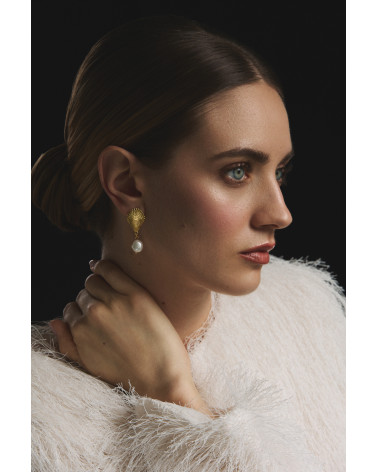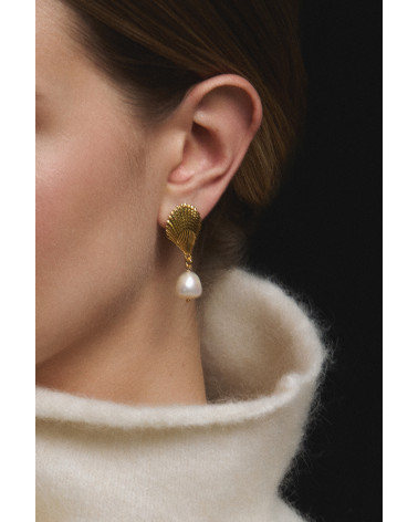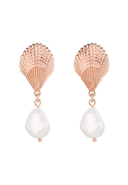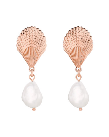 Złote kolczyki wykonane z muszli i naturalnych pereł słodkowodnych. Całość wykonana ze srebra 925 powlekanego 18 karatowym różowym złotem. Zapinane na sztyfty.
