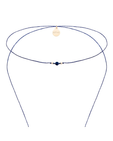 Minimalistyczny długi granatowy choker wykonany z najwyższej jakości sznureczka, fasetowanego granatowego agatu, malutkich złotych kuleczek, dwóch chwostów oraz zawieszki z logo marki. Wszystkie elementy wykonane są ze srebra 925 powlekanego 18 karatowym różowym złotem. Rozmiar chokera jest uniwersalny. Oplata się go dwukrotnie wokół szyi i reguluje odległość łączenia do szyj za pomocą kuleczki regulacyjnej.
