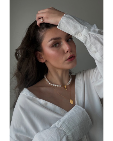Złoty naszyjnik wykonany z naturalnych pereł słodkowodnych i zawieszką z logo marki. Wszystkie elementy wykonane ze srebra 925 powlekanego 18 karatowym różowym złotem.