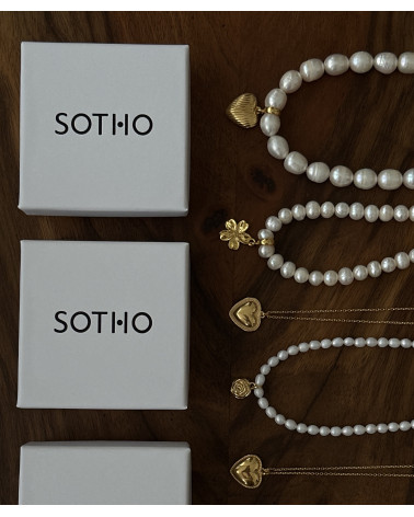 Złoty naszyjnik wykonany z naturalnych pereł słodkowodnych z niezapominajką i zawieszką z logo marki. Wszystkie elementy wykonane ze srebra 925 powlekanego 24 karatowym żółtym złotem.