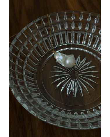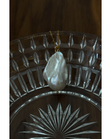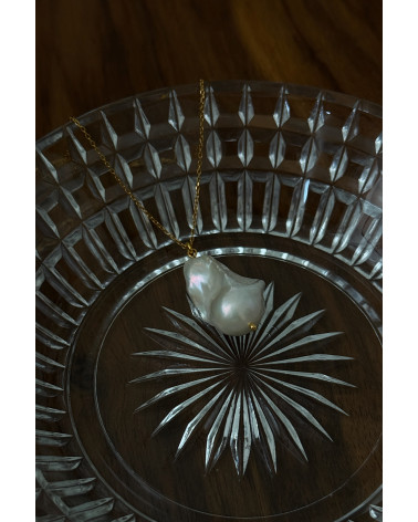 Złoty naszyjnik z barokową perłą i zawieszką z logo marki. Wszystkie elementy wykonane ze srebra 925 powlekanego 24 karatowym żółtym złotem.