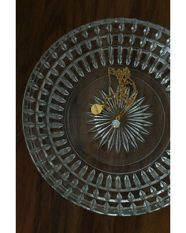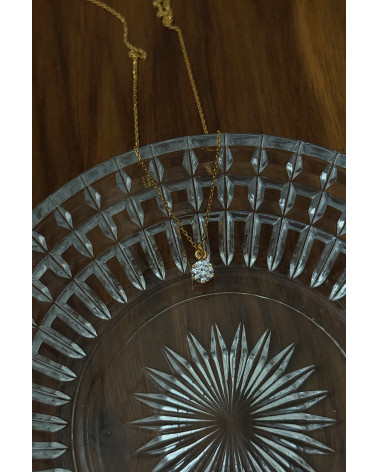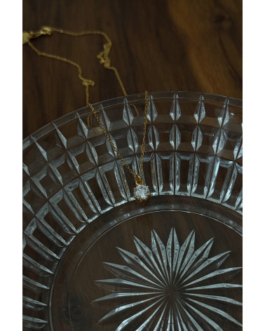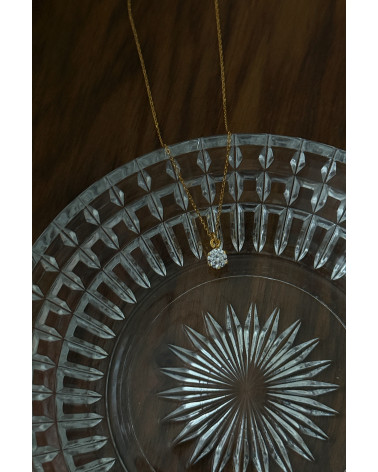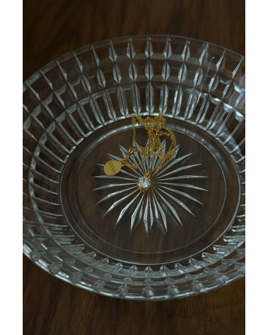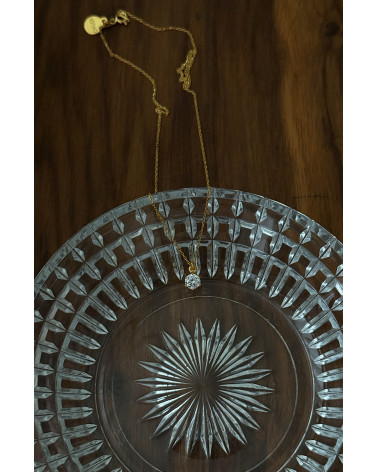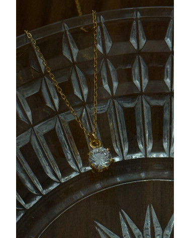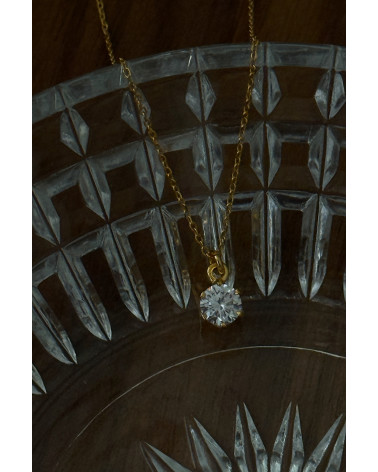 Złoty naszyjnik z bezbarwną cyrkonią i zawieszką z logo marki. Wszystkie elementy wykonane ze srebra 925 powlekanego 24 karatowym żółtym złotem.