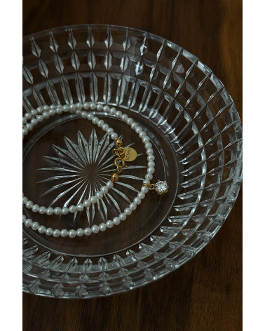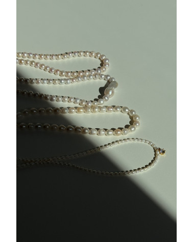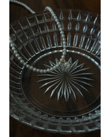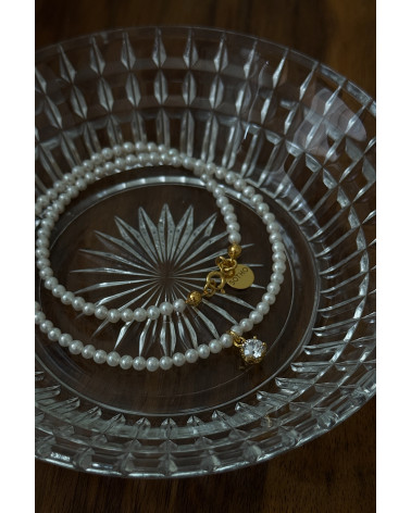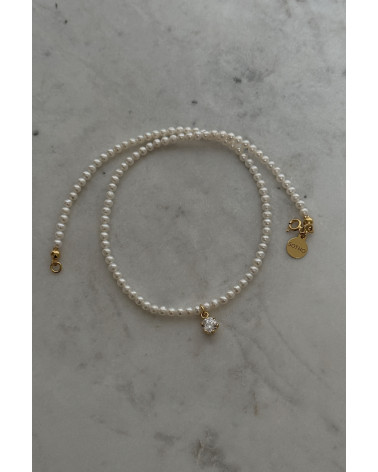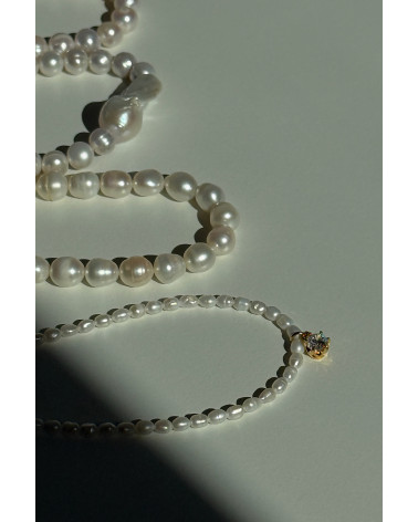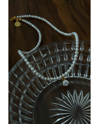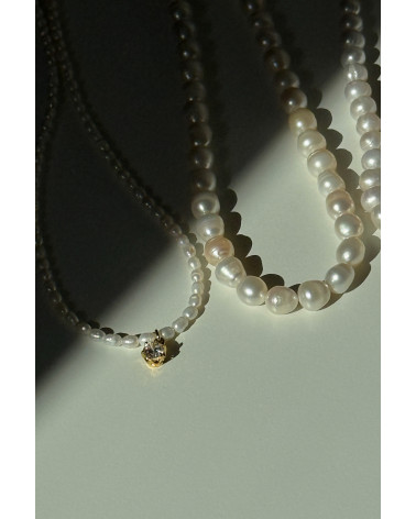 Złoty naszyjnik wykonany z naturalnych pereł słodkowodnych z bezbarwną cyrkonią i zawieszką z logo marki. Wszystkie elementy wykonane ze srebra 925 powlekanego 24 karatowym żółtym złotem.