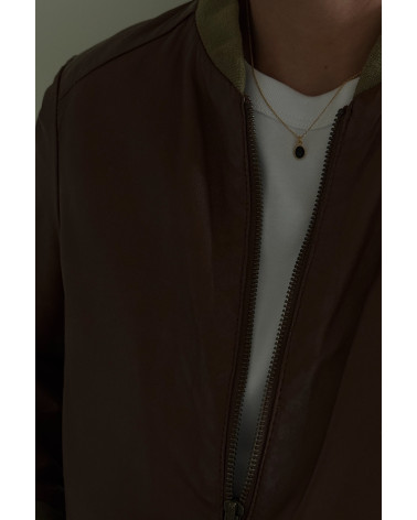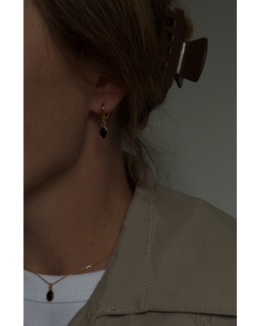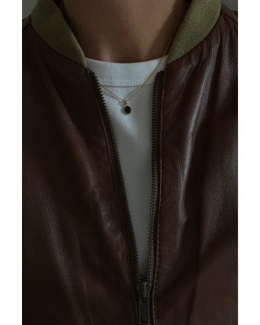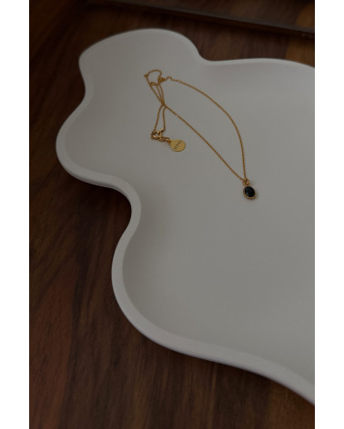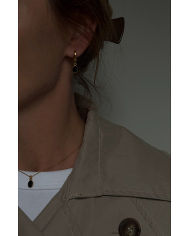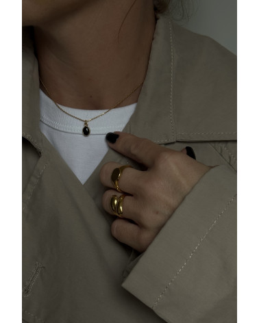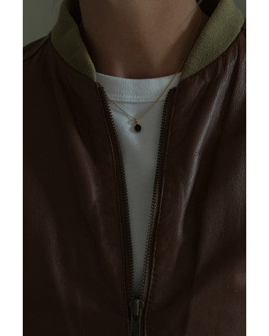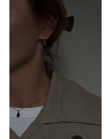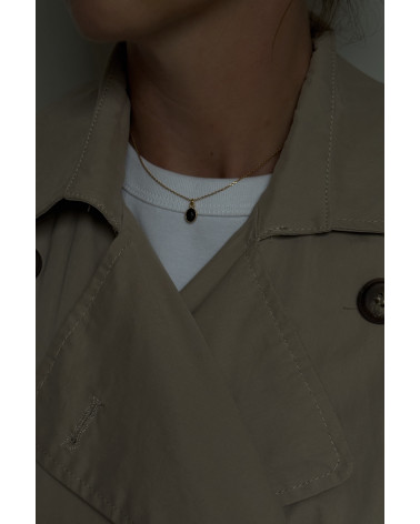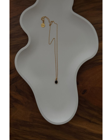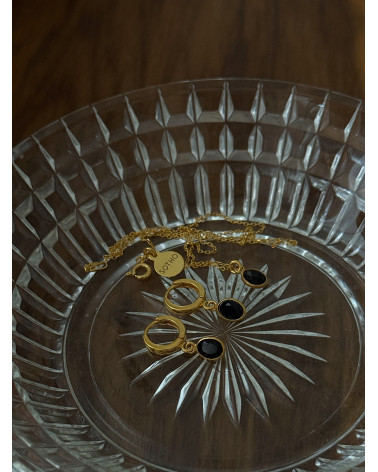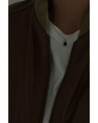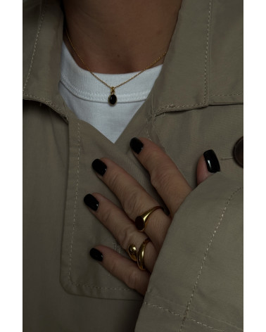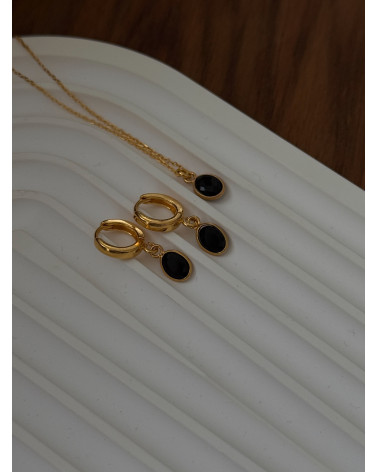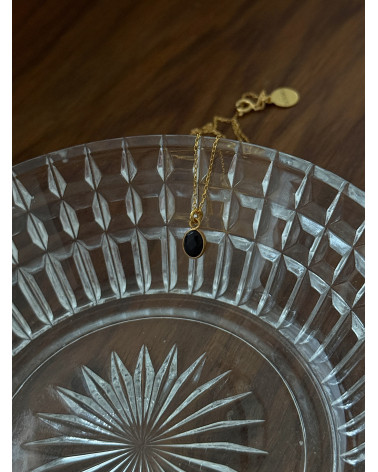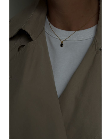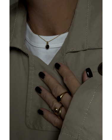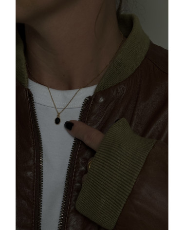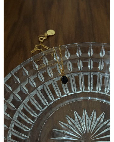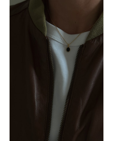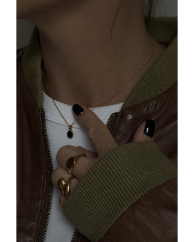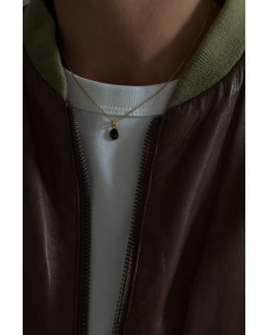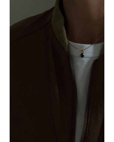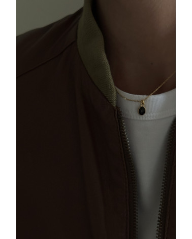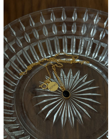Złoty naszyjnik z onyksem i zawieszką z logo marki. Wszystkie elementy wykonane ze srebra 925 powlekanego 24 karatowym żółtym złotem.