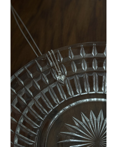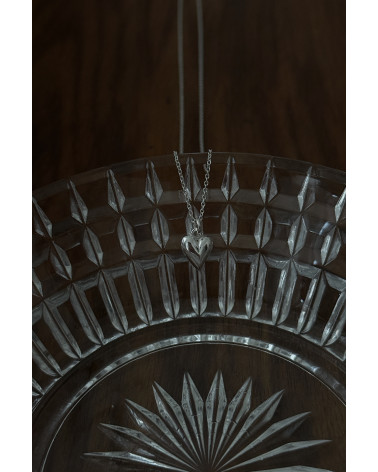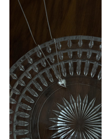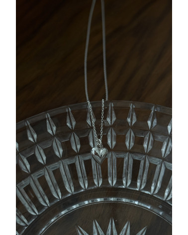 Srebrny naszyjnik z małym serduszkiem 3D oraz zawieszką z logo marki. Całość wykonana ze srebra 925