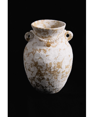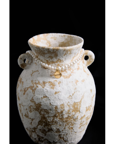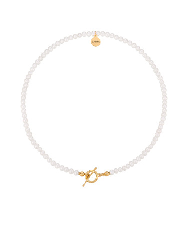 Naszyjnik wykonany z naturalnych pereł słodkowodnych, zdobiony zapięciem i zawieszką z logo marki. Wszystkie elementy wykonane ze srebra 925 powlekanego 24 karatowym żółtym złotem.