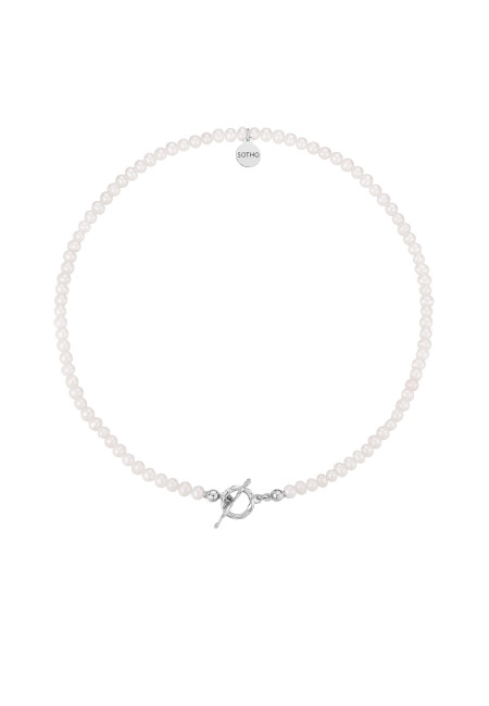 Srebrny naszyjnik wykonany z naturalnych pereł słodkowodnych, zdobiony zapięciem i zawieszką z logo marki. Wszystkie elementy wykonane ze srebra 925.