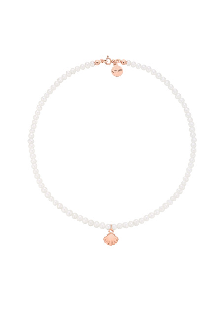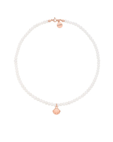 Naszyjnik wykonany z naturalnych pereł słodkowodnych z muszelką i zawieszką z logo marki. Wszystkie elementy wykonane ze srebra 925 powlekanego 18 karatowym różowym złotem.
