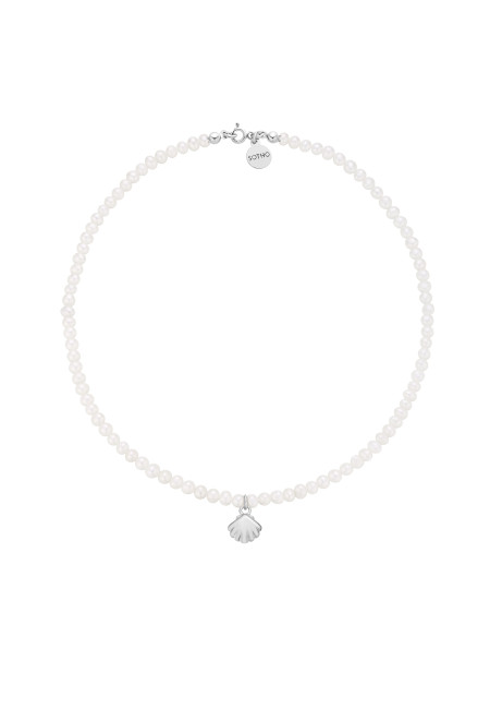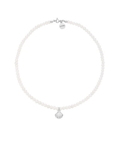 Srebrny naszyjnik wykonany z naturalnych pereł słodkowodnych z muszelką i zawieszką z logo marki. Wszystkie elementy wykonane ze srebra 925.