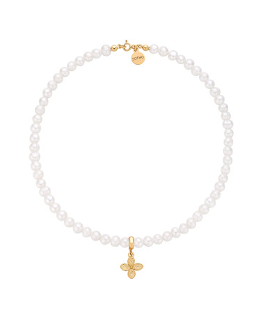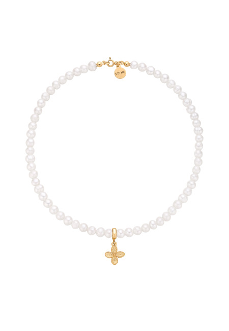 Złoty naszyjnik wykonany z naturalnych pereł słodkowodnych z kwiatkiem i zawieszką z logo marki. Wszystkie elementy wykonane ze srebra 925 powlekanego 24 karatowym żółtym złotem .