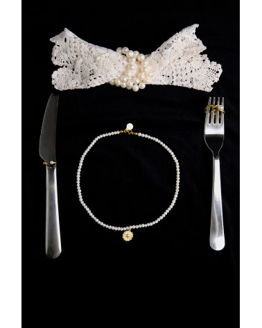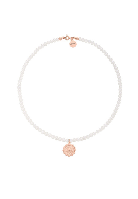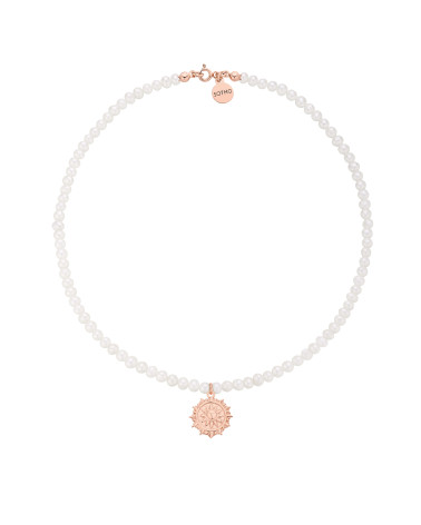 Naszyjnik wykonany z naturalnych pereł słodkowodnych ze słońcem i zawieszką z logo marki. Wszystkie elementy wykonane ze srebra 925 powlekanego 18 karatowym różowym złotem.