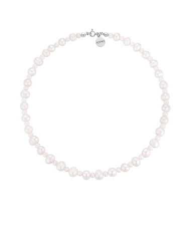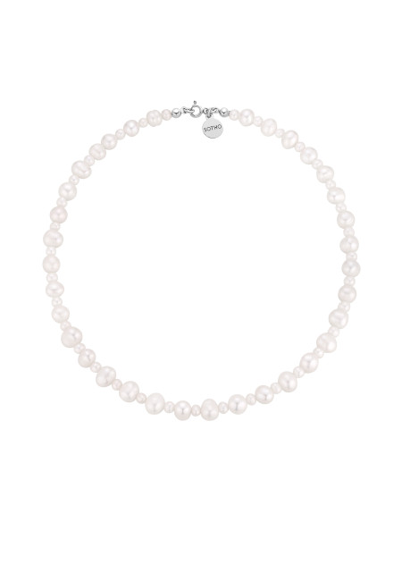 Srebrny naszyjnik wykonany z naturalnych pereł słodkowodnych, zdobiony zawieszką z logo marki. Wszystkie elementy wykonane ze srebra 925.