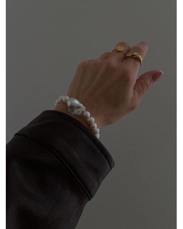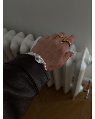 Złoty owalny pierścionek o nieregularnej fakturze wykonany ze srebra 925 powlekanego 24 karatowym żółtym złotem.