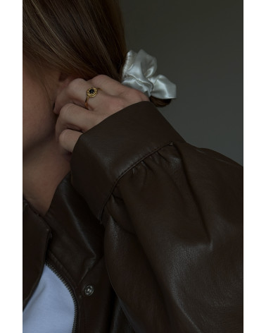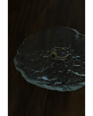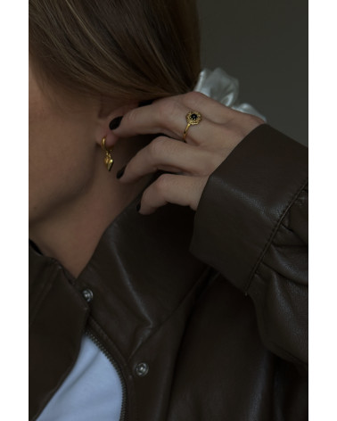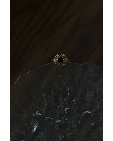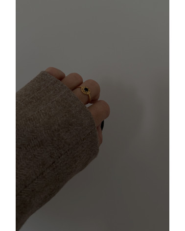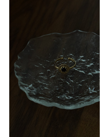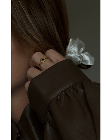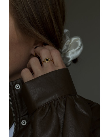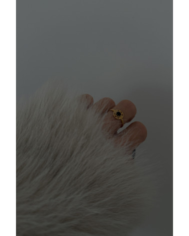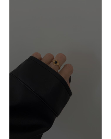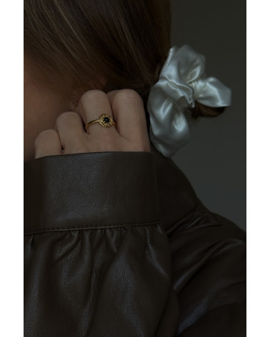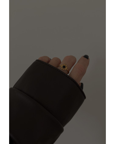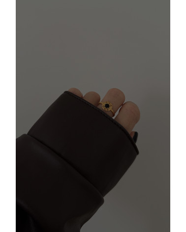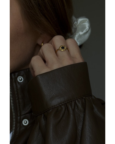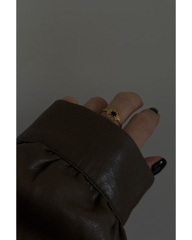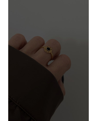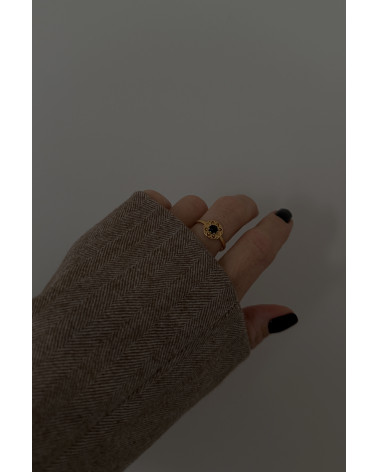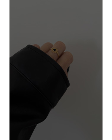 Złoty pierścionek z rozetą i onyksem wykonany ze srebra 925 powlekanego 24 karatowym żółtym złotem.