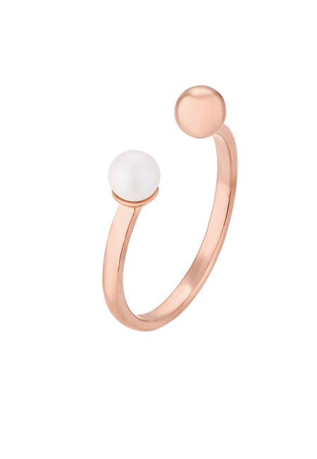 Złoty pierścionek zdobiony kuleczką i perłą w kolorze perłowym opalizującym Pearlescent. Wszystkie elementy wykonane ze srebra 925 powlekanego 18 karatowym różowym złotem.